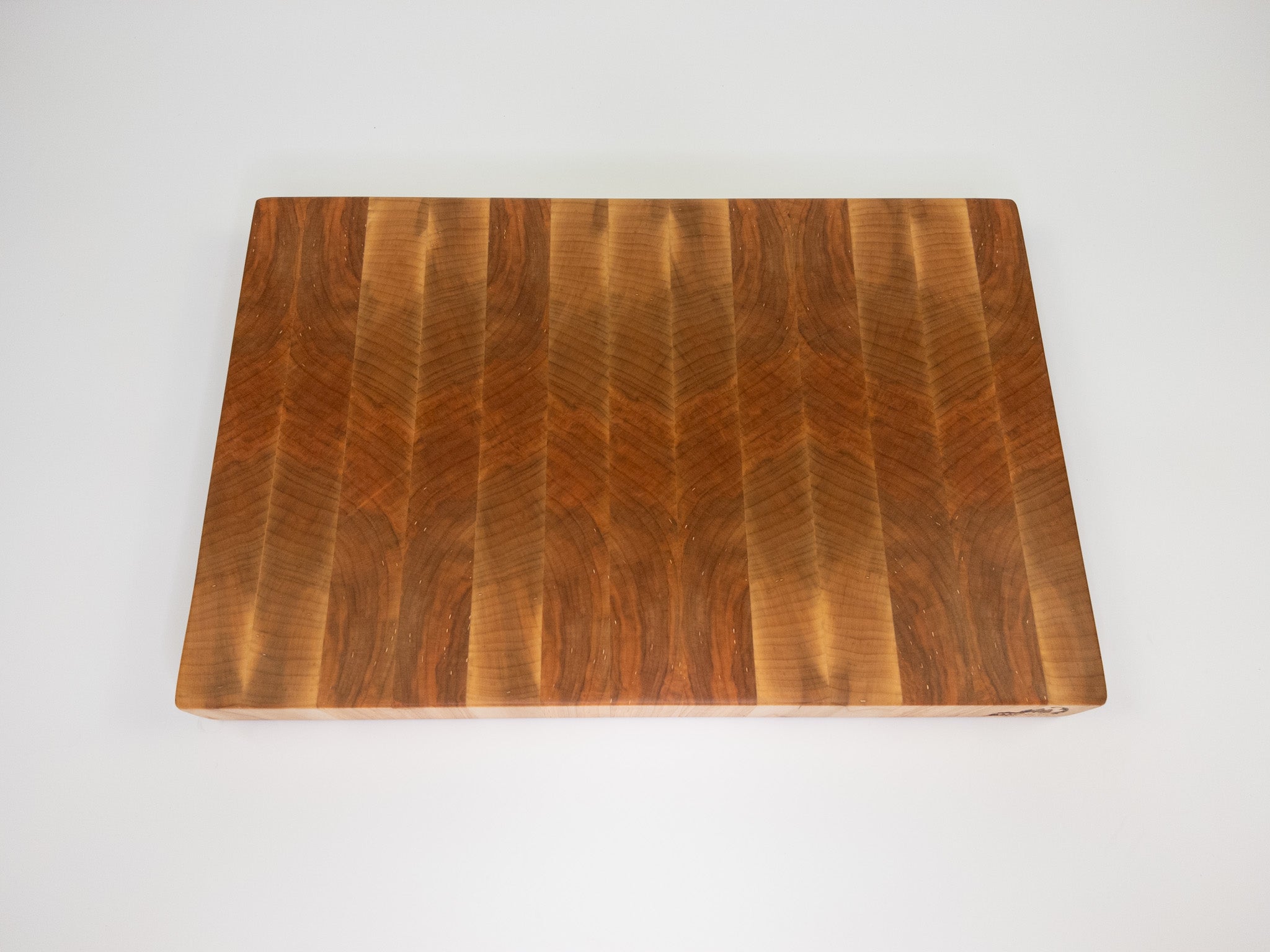 We work primarily with hard maple, walnut, and cherry — dense, closed-grain hardwoods that are food-safe, durable, and beautiful. We also work with rarer species like hickory and exotics like padauk and canarywood for boards that call for something bolder. Each species is chosen for its density, stability, and how it plays with the pattern design.