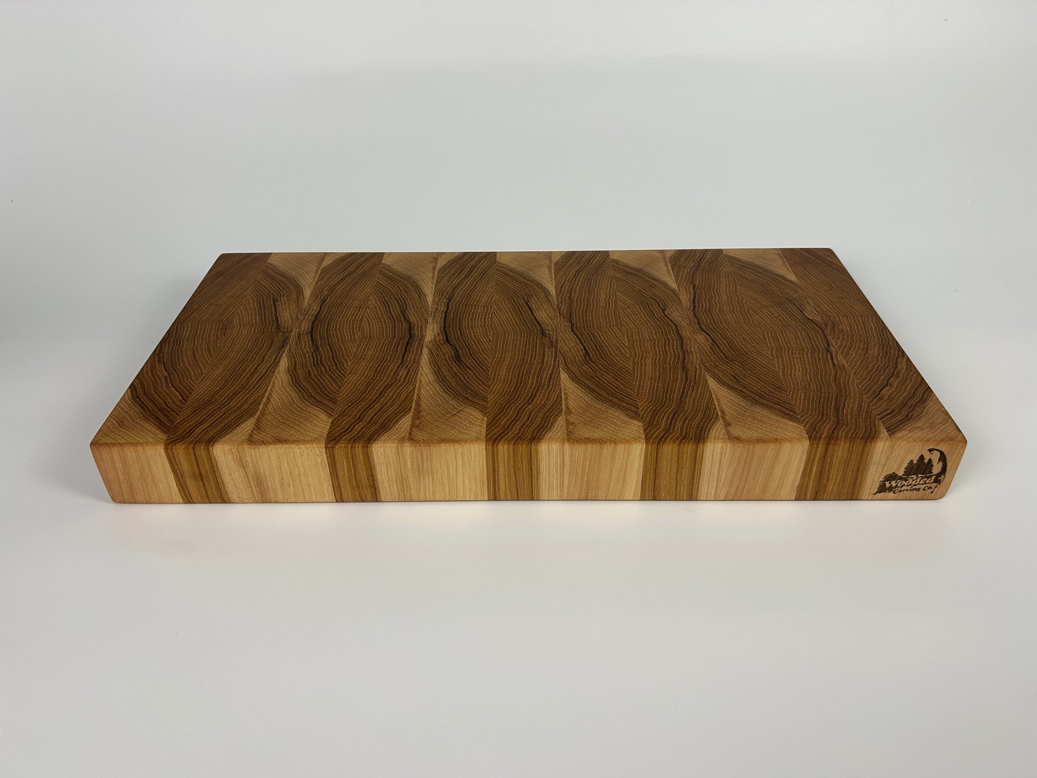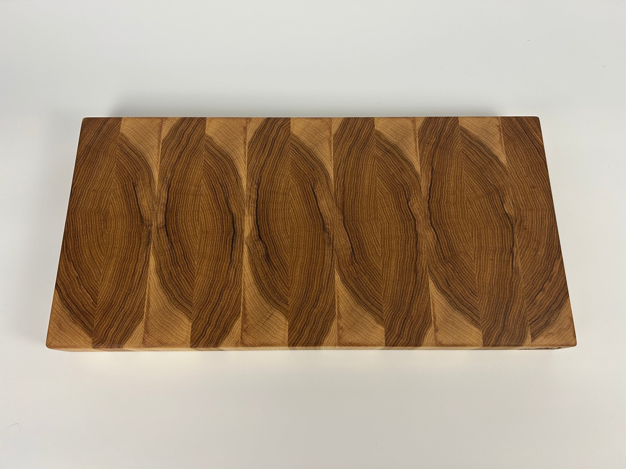 We work primarily with hard maple, walnut, and cherry — dense, closed-grain hardwoods that are food-safe, durable, and beautiful. We also work with rarer species like hickory and exotics like padauk and canarywood for boards that call for something bolder. Each species is chosen for its density, stability, and how it plays with the pattern design.