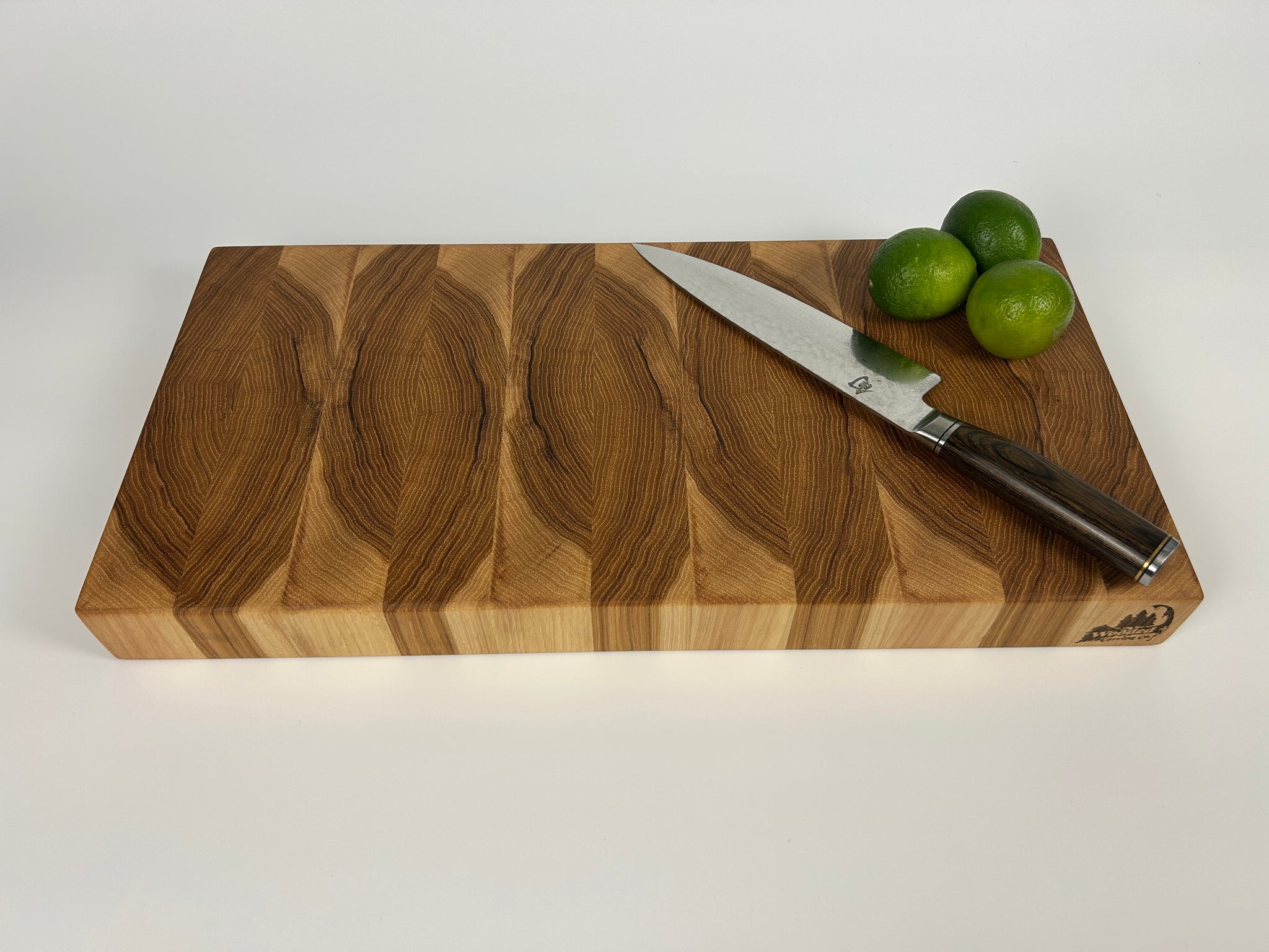End-grain boards expose the cut ends of wood fibers on the cutting surface. Your knife slips between fibers instead of slicing across them — so the board is gentler on blades and self-heals minor cut marks over time. Compare that to long-grain boards (also called edge-grain, face-grain, or flat-grain), where your knife cuts across the fibers — dulling blades faster and leaving permanent score marks. Learn more about grain orientation.