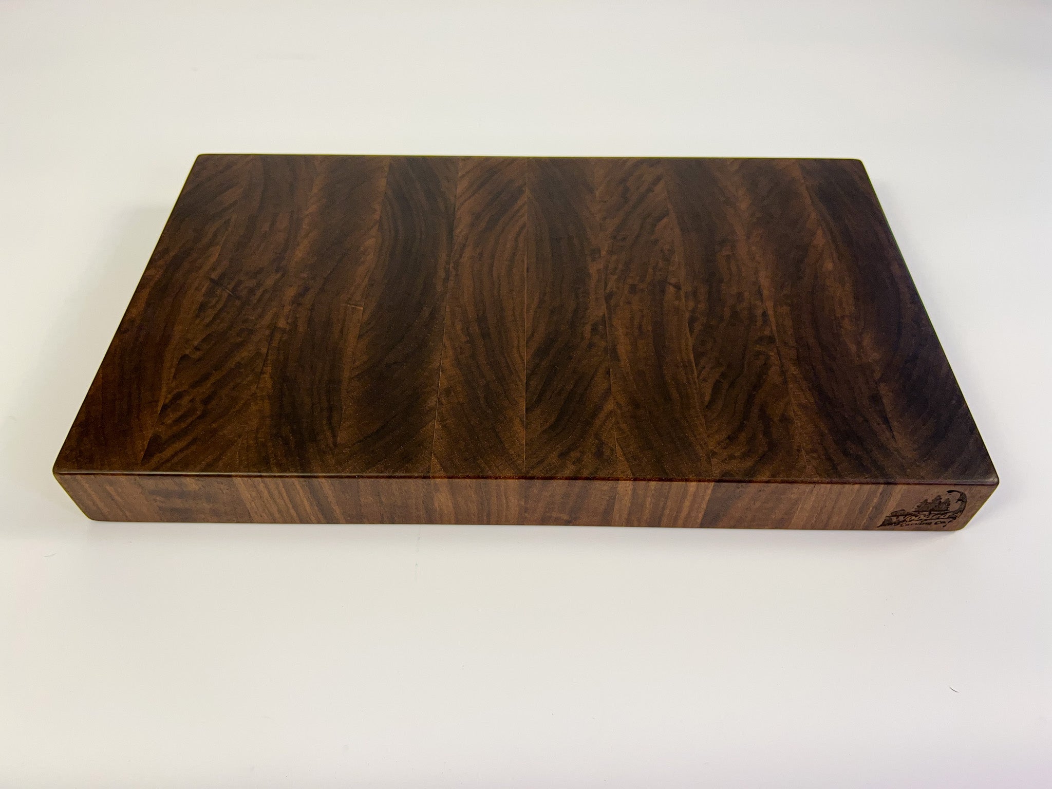 We work primarily with hard maple, walnut, and cherry — dense, closed-grain hardwoods that are food-safe, durable, and beautiful. We also work with rarer species like hickory and exotics like padauk and canarywood for boards that call for something bolder. Each species is chosen for its density, stability, and how it plays with the pattern design.