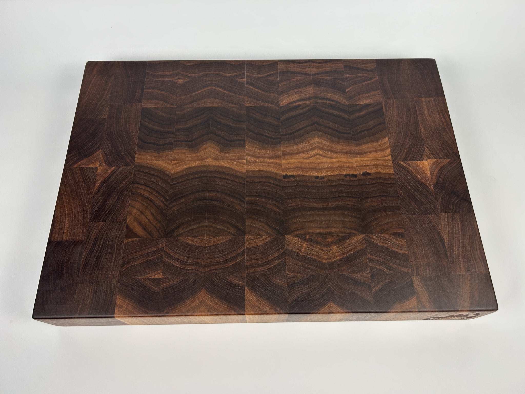 End-grain boards expose the cut ends of wood fibers on the cutting surface. Your knife slips between fibers instead of slicing across them — so the board is gentler on blades and self-heals minor cut marks over time. Compare that to long-grain boards (also called edge-grain, face-grain, or flat-grain), where your knife cuts across the fibers — dulling blades faster and leaving permanent score marks. Learn more about grain orientation.