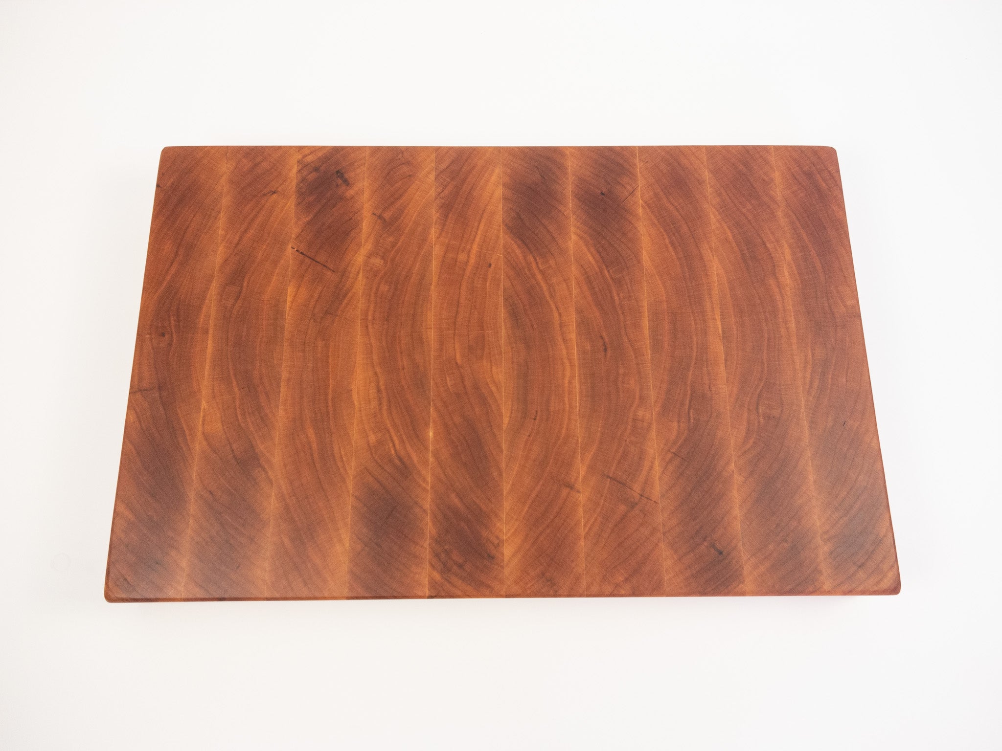 We work primarily with hard maple, walnut, and cherry — dense, closed-grain hardwoods that are food-safe, durable, and beautiful. We also work with rarer species like hickory and exotics like padauk and canarywood for boards that call for something bolder. Each species is chosen for its density, stability, and how it plays with the pattern design.