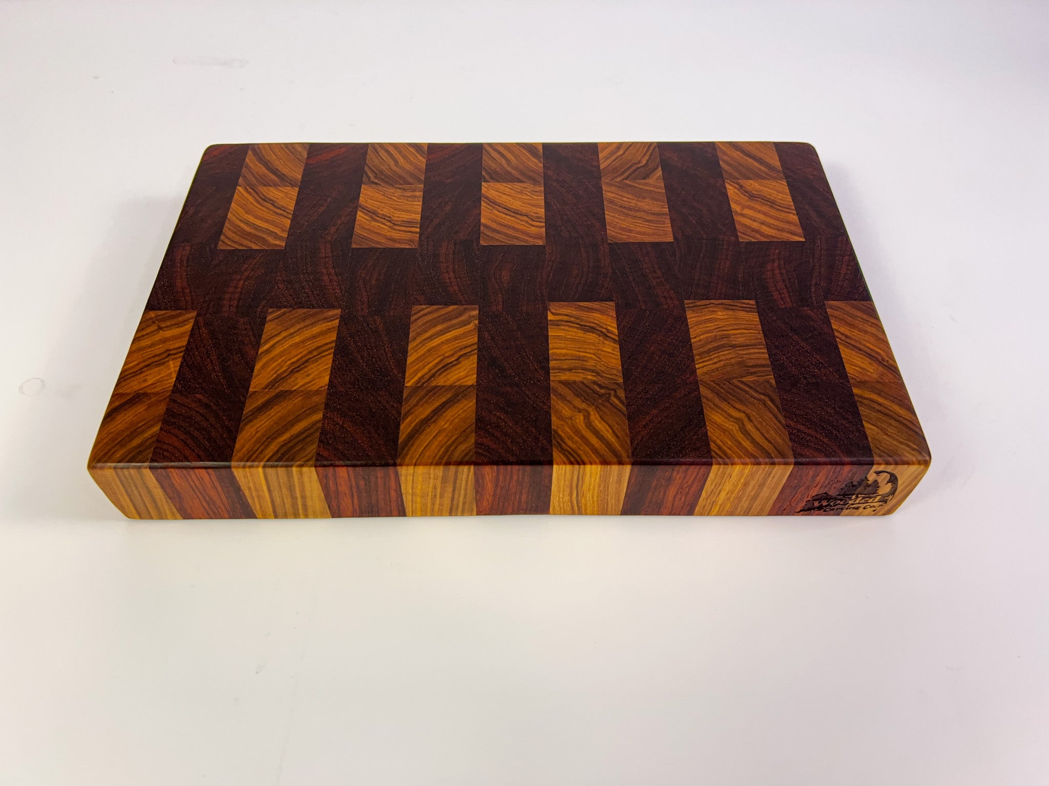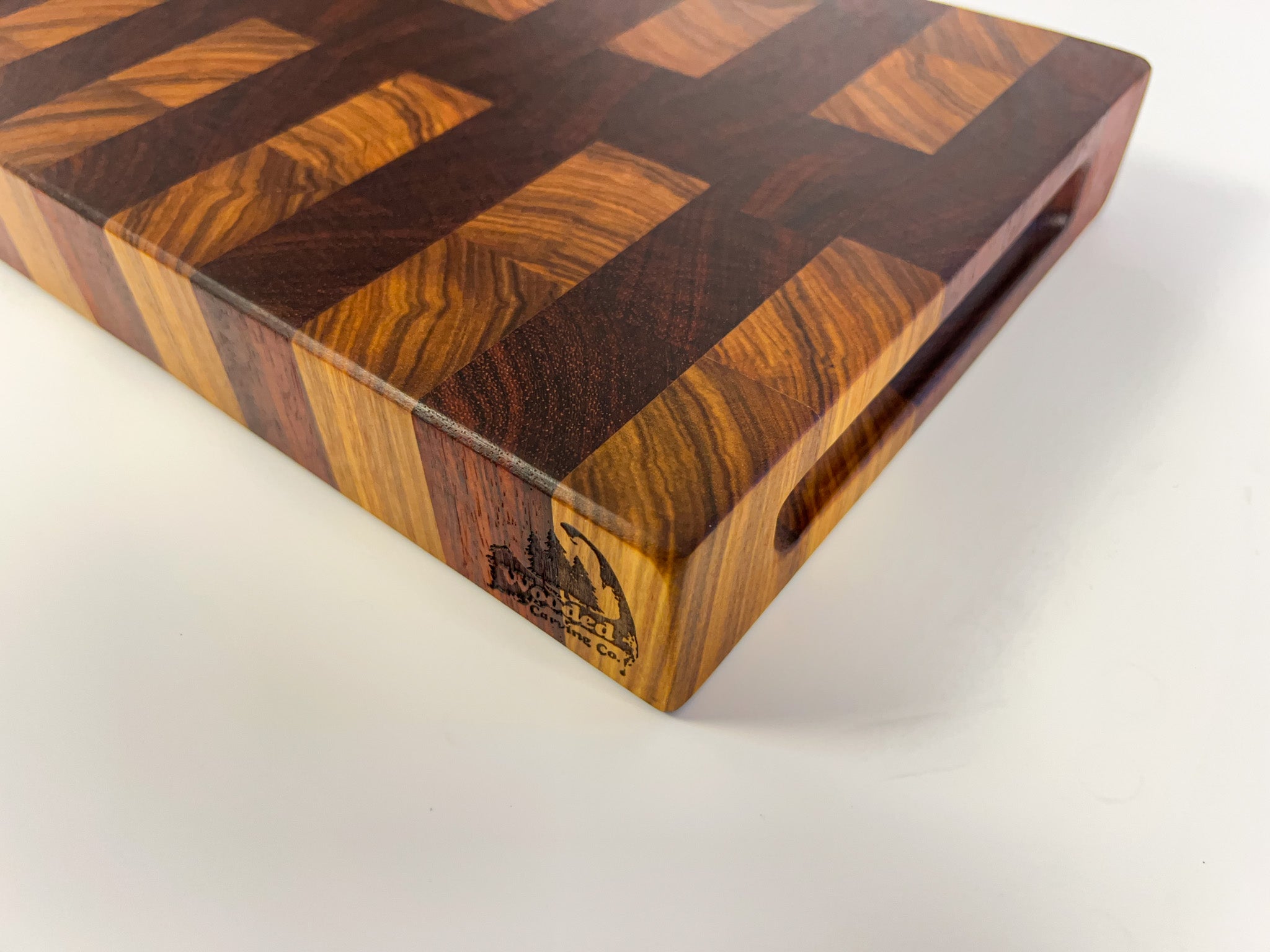 We work primarily with hard maple, walnut, and cherry — dense, closed-grain hardwoods that are food-safe, durable, and beautiful. We also work with rarer species like hickory and exotics like padauk and canarywood for boards that call for something bolder. Each species is chosen for its density, stability, and how it plays with the pattern design.