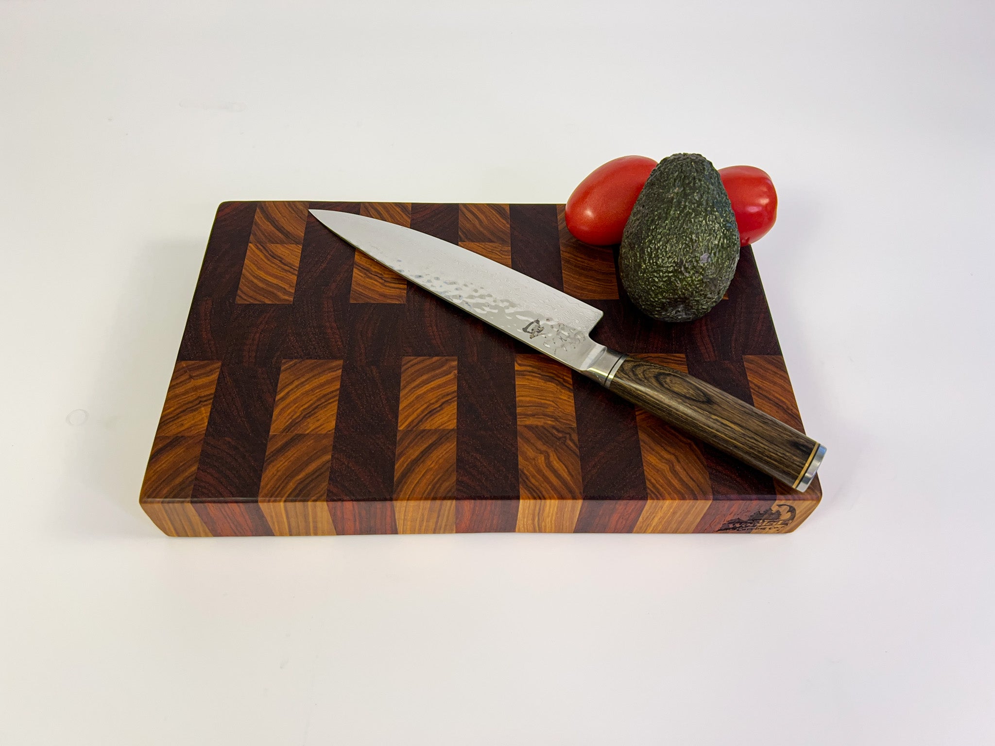 Meet the Red Canary—where culinary function meets gallery-worthy aesthetics. This end-grain cutting board pairs the rich hues of Canarywood and Padauk to create a wood grain display that stops conversations mid-chop. The end-grain construction is a knife's best friend, offering a gentle surface that keeps your blades in peak condition through endless prep work. Transition seamlessly from chopping station to centerpiece when guests arrive—this board handles both roles with equal flair. It's proof that the best kitchen tools don't just perform; they inspire.