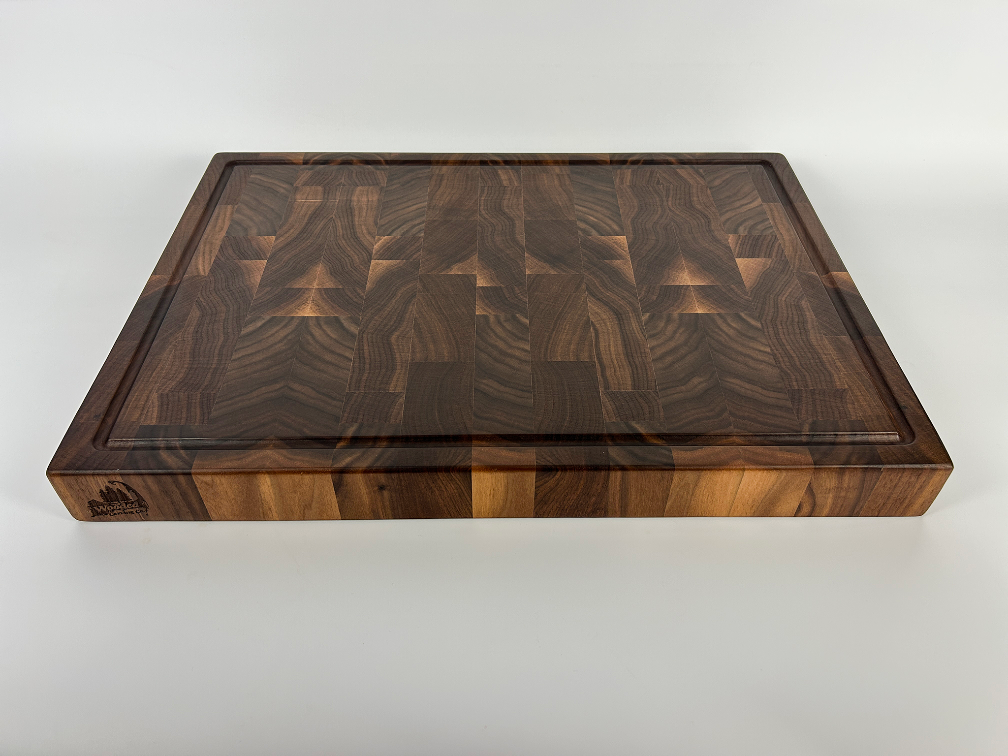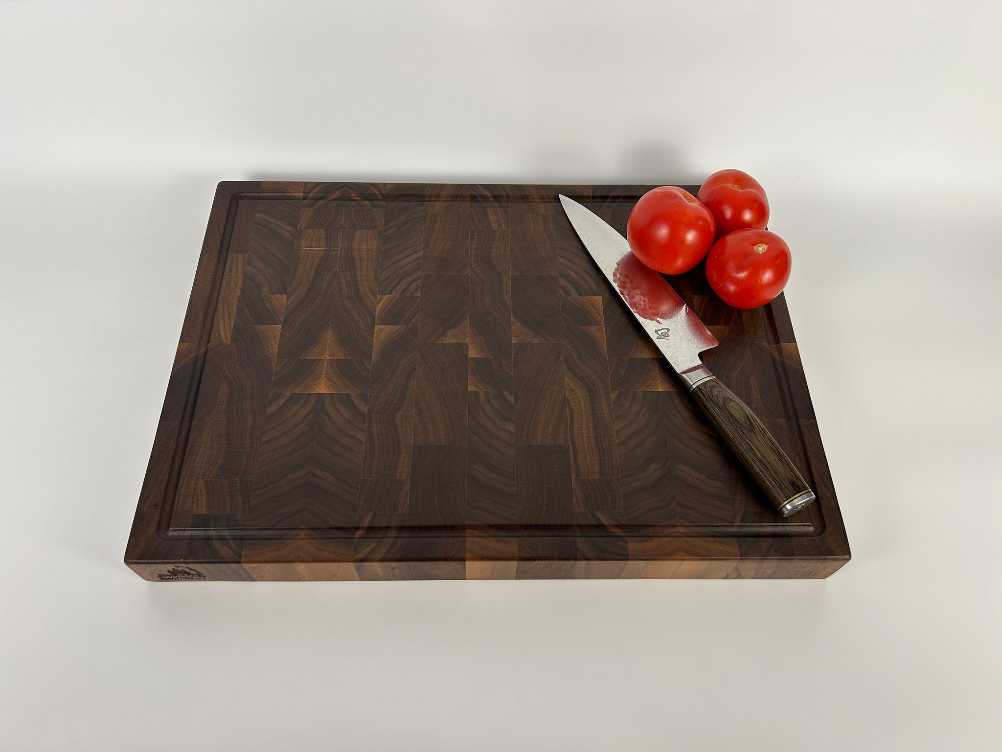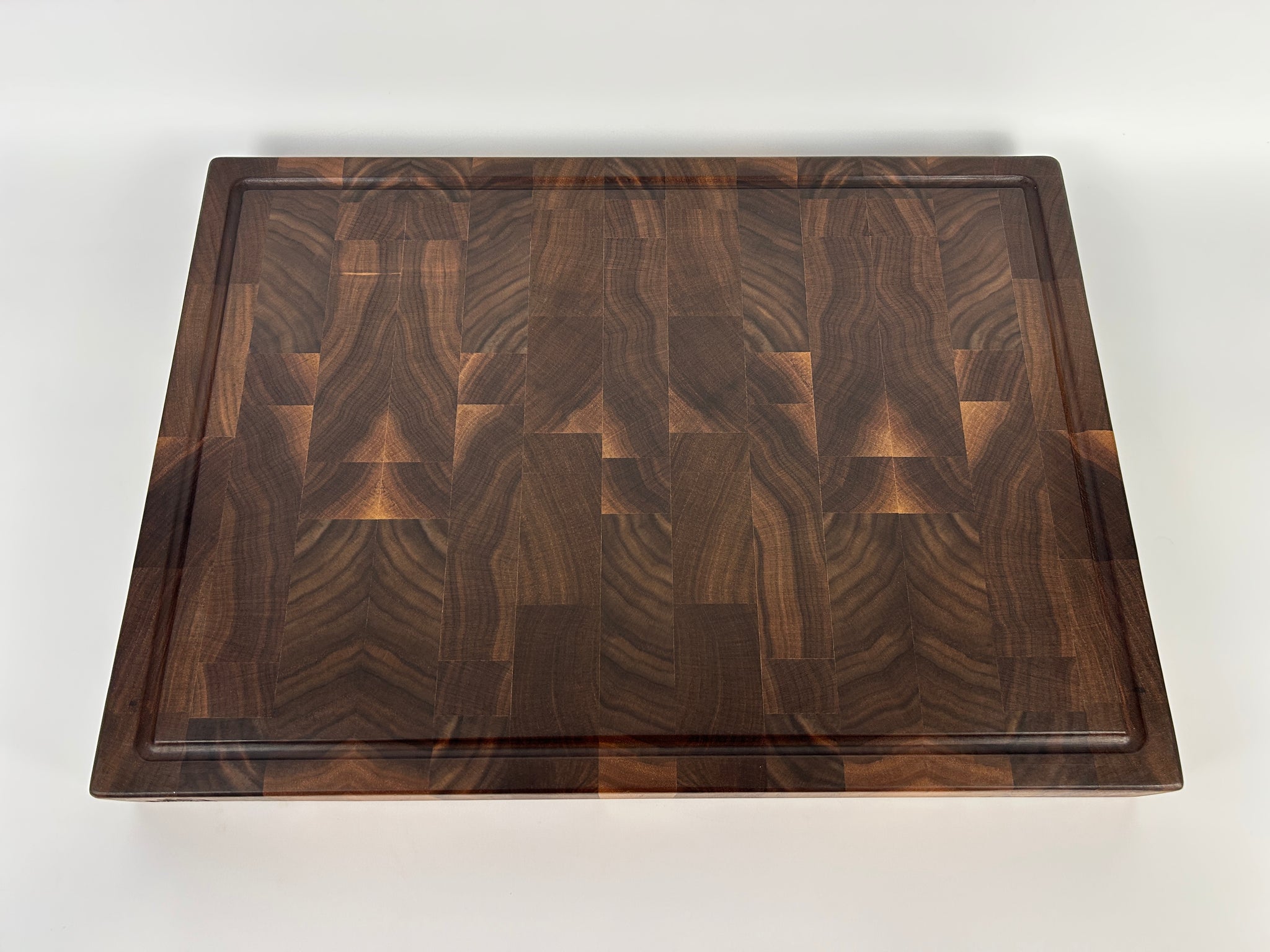 The Caves of Grain board channels the mesmerizing beauty of underground caverns through its striking walnut grain patterns. This elegant end-grain cutting surface showcases rich, contrasting wood tones punctuated by a luminous sapwood stripe running down the center—nature's own artwork. A practical juice groove hugs the edge, while the generous cutting area handles everything from delicate slicing to serious chopping and carving. Perfect for kitchens seeking both visual drama and everyday versatility.