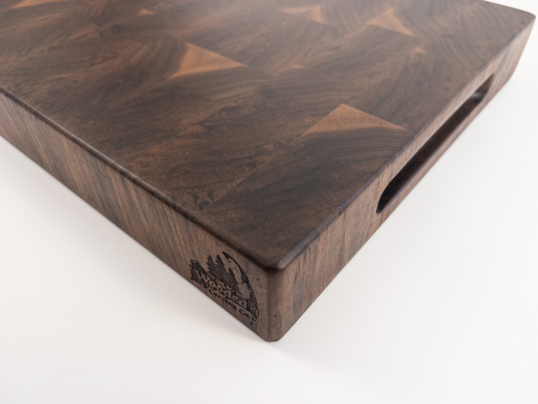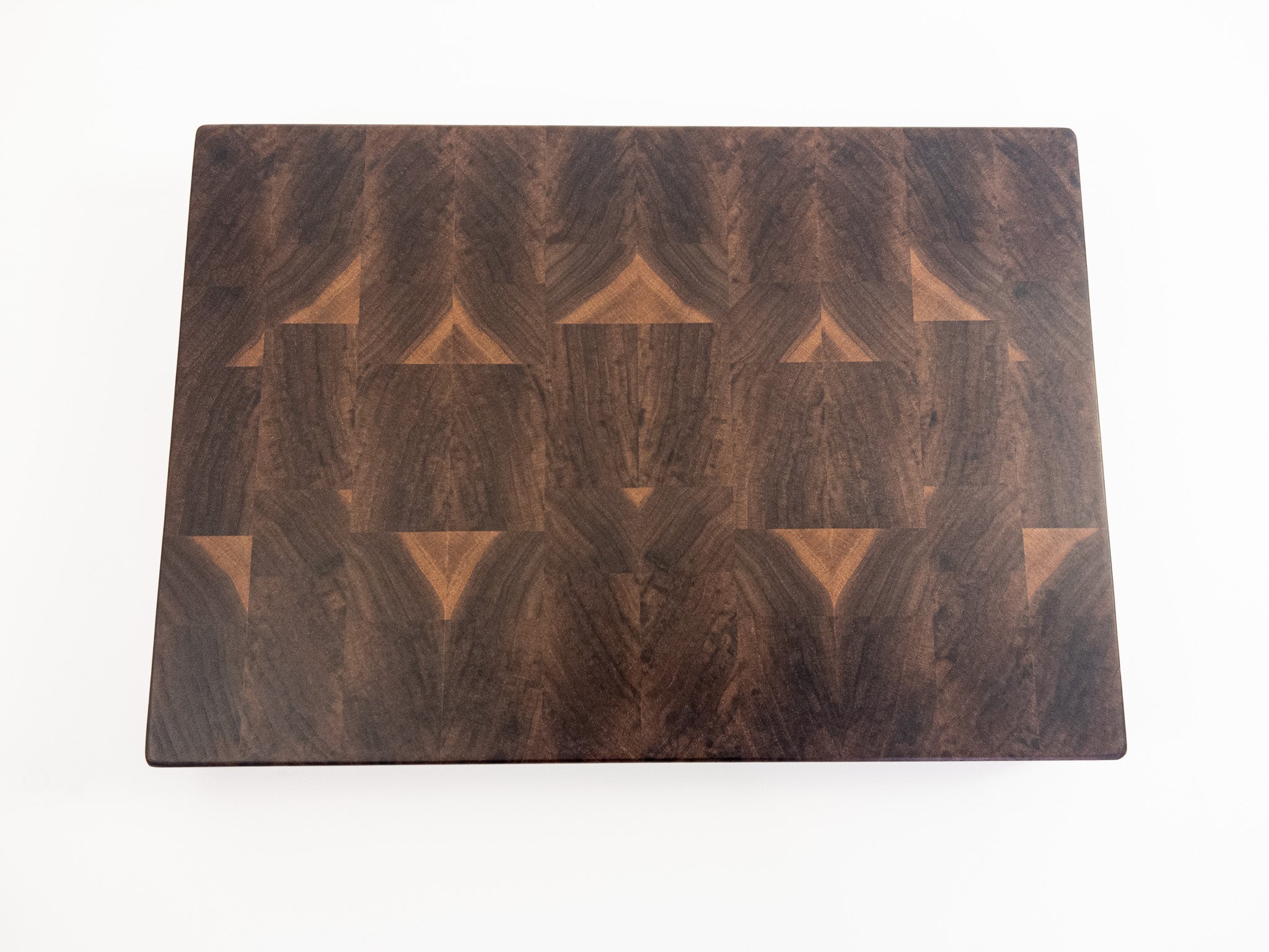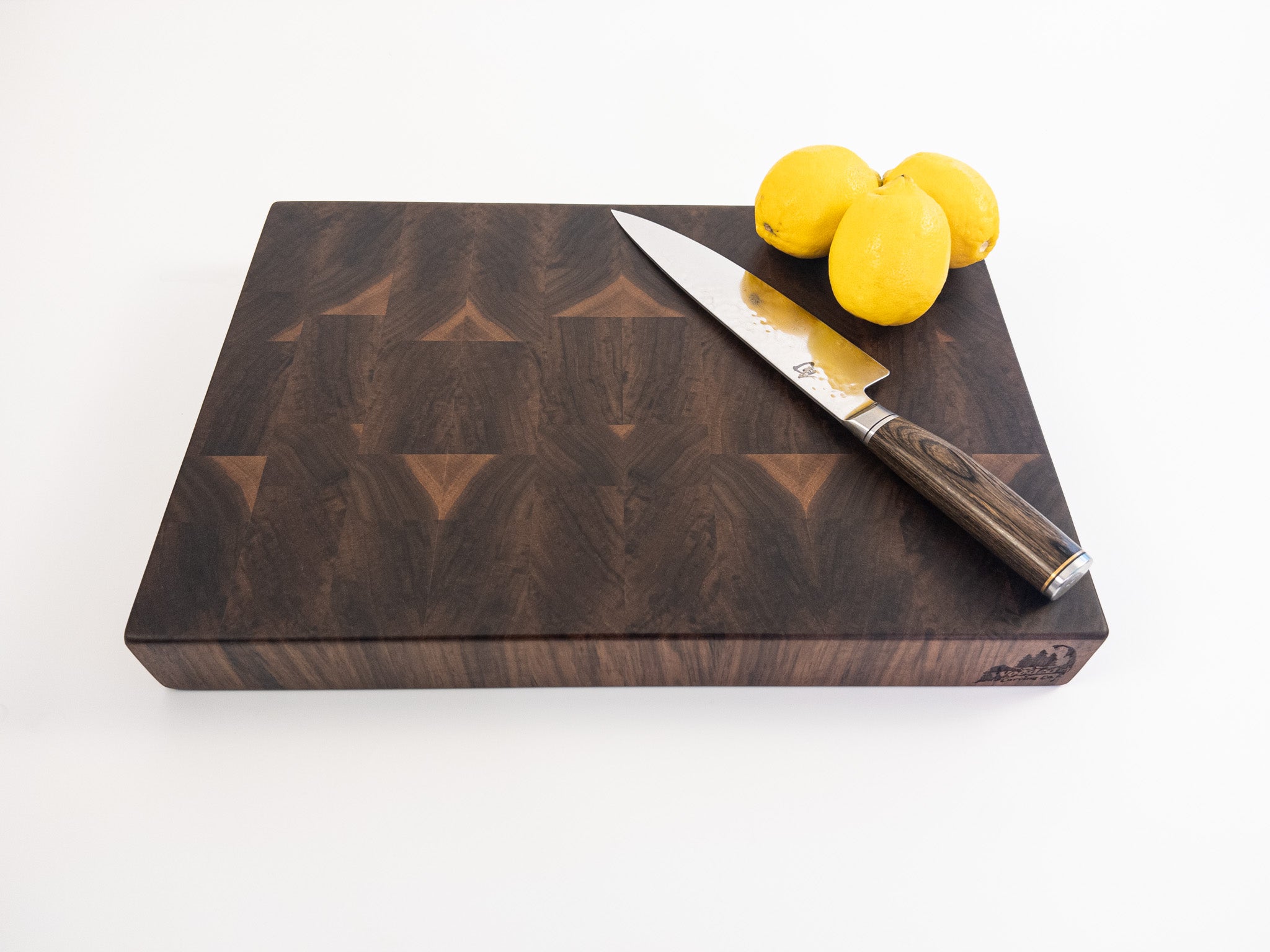 Walnut Peaks is an end-grain walnut board with a pattern that looks like a mountain range at golden hour—deep, smoky walnut with lighter “peaks” rising through the grain. The layout is meticulously arranged so the design reads bold from across the kitchen, then gets even better up close. Built end grain for the long game, it has that satisfying little give under your knife edge—great for daily chopping and kinder to blades over time. It’s equal parts workhorse and showpiece: ready for serious prep, and absolutely willing to steal the spotlight when you slide out a charcuterie spread or bread course.